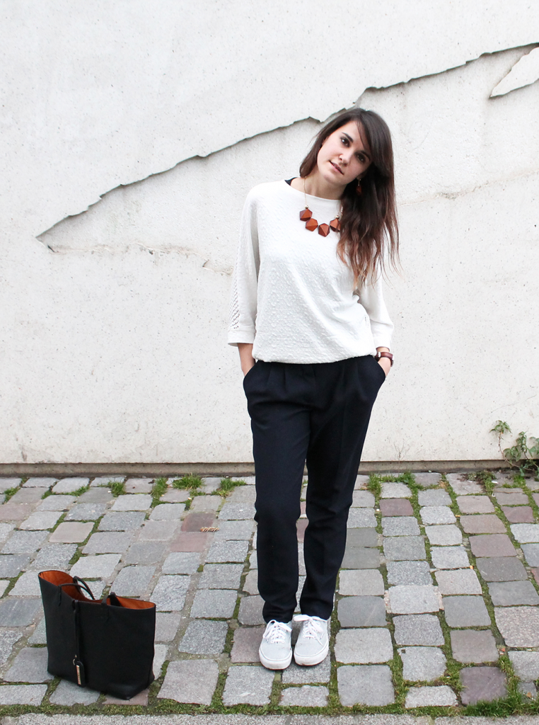 Et enfin, j’ai associé le tout avec un pull ajouré blanc et frais et mon petit pantalon à pinces que je ne quitte plus!